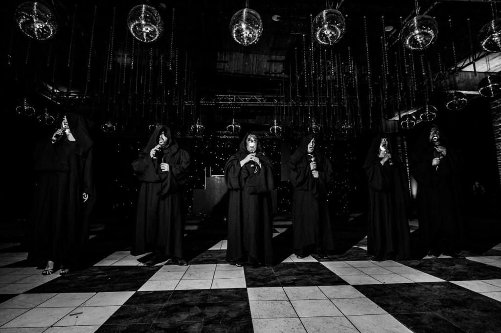 Impacta desde el misterio con una entrada teatral inesperada y visualmente potente, aparecen de entre medio de los invitados, artistas vestidos con sotanas negras y sus rostros iluminados.
